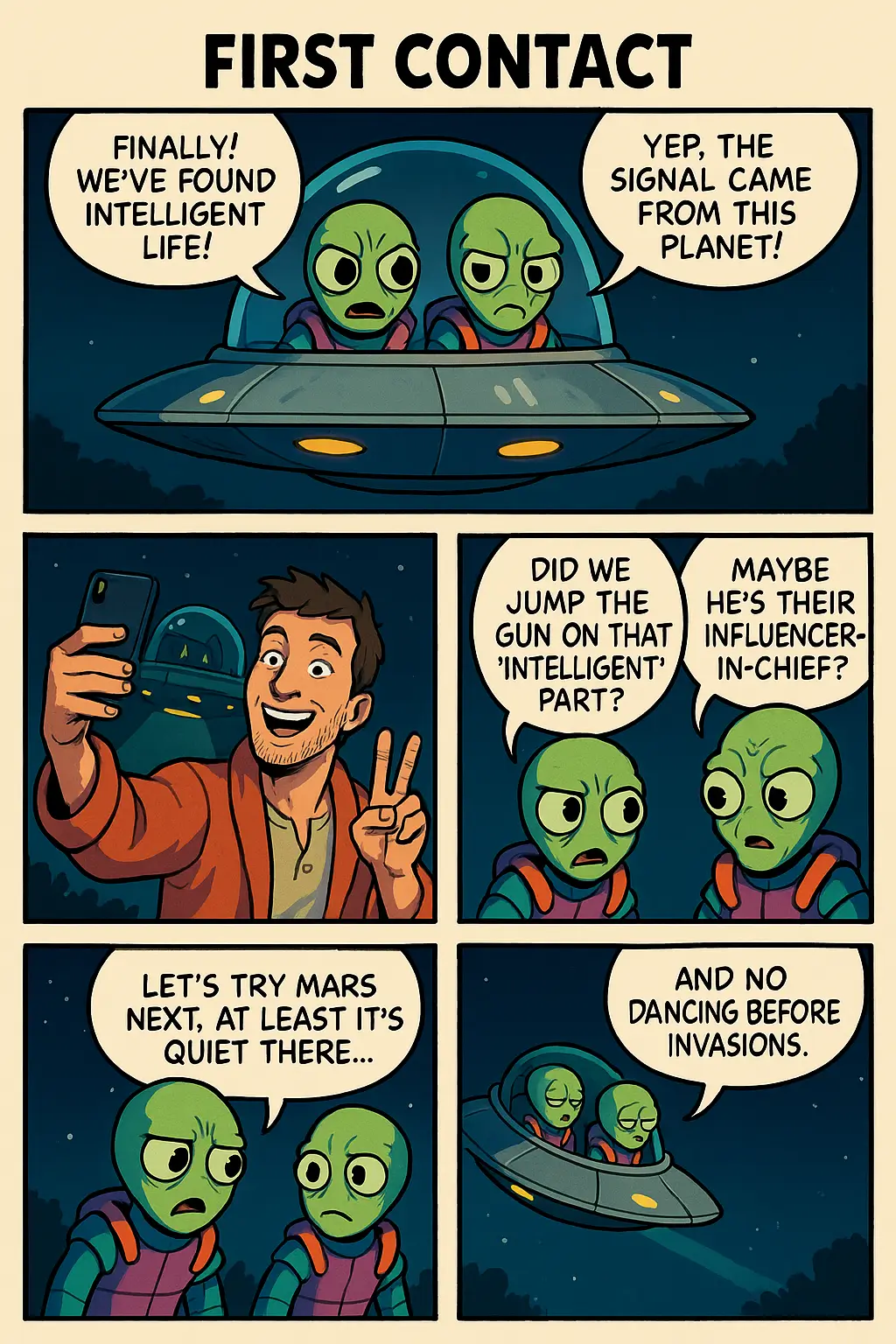 Panel 4: The spaceship is flying away into the starry sky. The aliens are sitting back, looking tired.