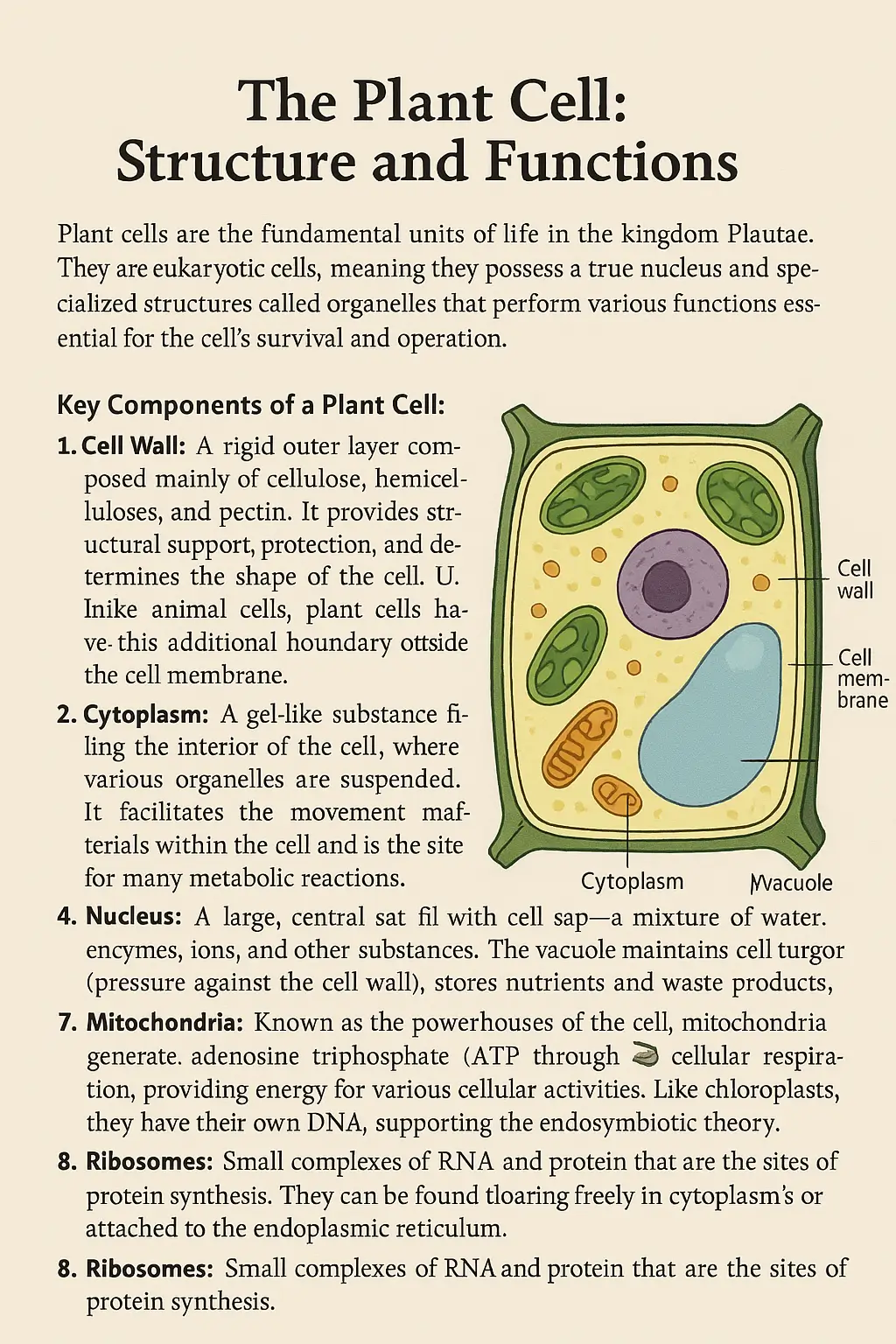 Please create for me a realistic and educational textbook-style illustration of a plant cell, labeled with its key parts: cell wall, cell membrane, chloroplasts, cytoplasm, nucleus, vacuole, mitochondria, and ribosomes. The image should resemble a page from a school biology textbook for middle school students. The layout should include a clear, colorful diagram in the center or on the right side, with neat English labels and soft background. Style: clean, scientific, easy to read, with a slight 2D flat aesthetic suitable for printed educational material.