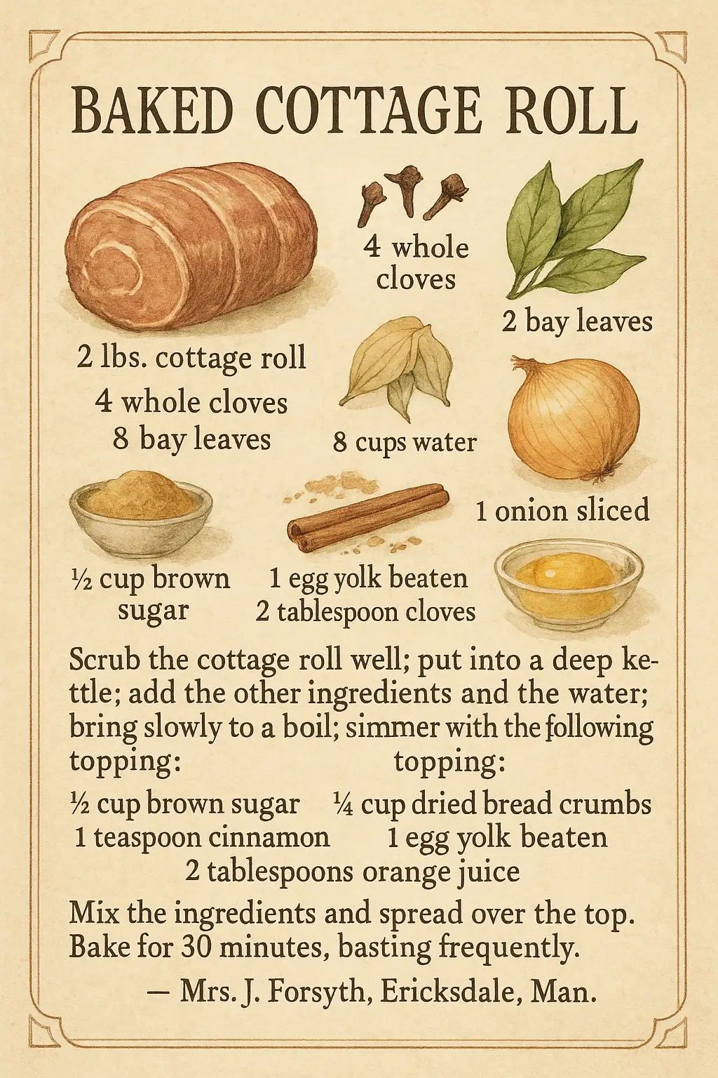 Please, create a vintage-style illustrated recipe book page featuring the recipe "Baked Cottage Roll". The design includes elegant, old-fashioned typography, delicate hand-drawn illustrations of ingredients (cottage roll, cloves, bay leaves, onion, brown sugar, cinnamon, egg yolk, orange juice, bread crumbs), and a parchment-style textured background. The text of the recipe is clearly readable in a retro serif font. The layout is charming and nostalgic, reminiscent of 1950s cookbooks. Include decorative borders and subtle watercolor elements. Warm, earthy color palette.